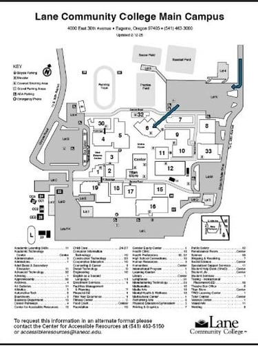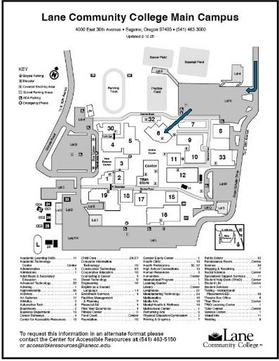 When exiting from I-5 at the E 30th Avenue exit, park in lot N, which is the first lot you come to from East 30th Avenue, then walk to the back door of building 6 as shown on the map.